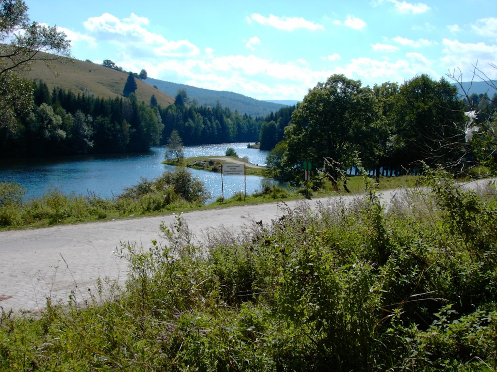 Das Dorf mit Stausee von den drei Kreuzen aus.